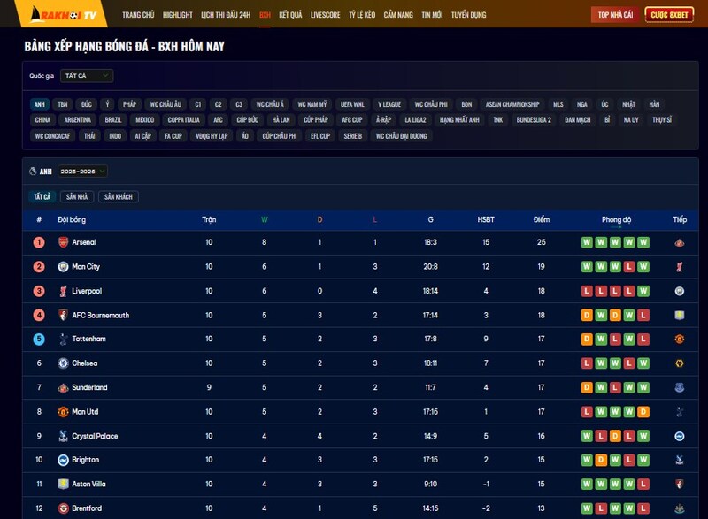 Đặc biệt, Rakhoi Link nổi bật với bảng xếp hạng bóng đá anh, nơi có giải Ngoại hạng Anh, giải đấu được yêu thích nhất tại Việt Nam. Bảng xếp hạng được cập nhật liên tục real-time: