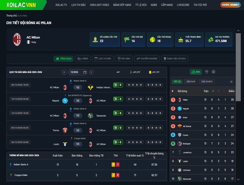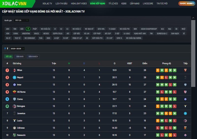 Sự chính xác của bảng xếp hạng cũng là điểm cộng lớn của trang web này. Xoilacvn không đăng tải tùy tiện mà lấy dữ liệu từ hệ thống cập nhật chính thức của Serie A, giảm tối đa mọi sai sót. Với tôi, điều này cực kỳ quan trọng, vì không gì khó chịu hơn việc xem một bảng xếp hạng sai lệch rồi phải kiểm tra chéo nhiều nơi khác.